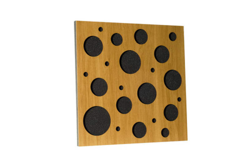 Оригінальна акустична панель Ecosound EcoBubble cream зі стильною, дерев'яною накладкою, з круглими прорізами різних розмірів. Дані панелі широко використовуються в цілях корекції звуку, покращення його якості та поглинання шумових ефектів і еха. Виготовляються з якісного акустичного пенополіуретану, повністю безпечного для здоров'я людини. Ідеально підходять для професійних студій звукозапису, телебачення, радіо, кінотеатрів. Коефіцієнт звукопоглинання становить 0,8. Розмір панелі становить 50 см x 50 см, при товщині 7,3 см. Крім стандартної установки на стіни, акустична панель Ecosound EcoBubble cream може використовуватися в системах акустичних підвісних стель.