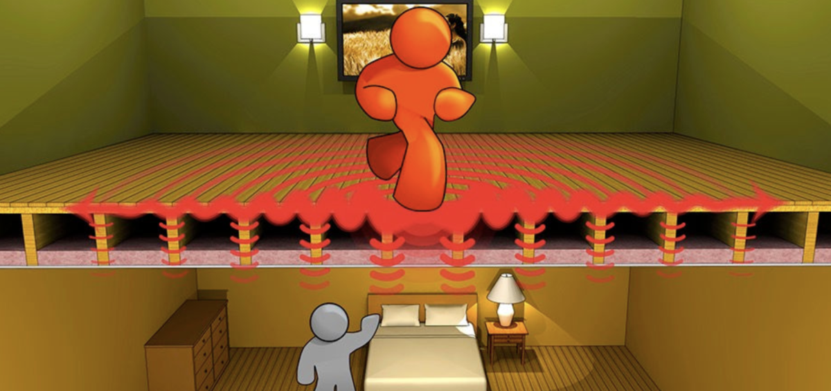 Типичные звуки,которые проходят через пол-в потолок нижней квартиры это звуки шагов, голоса, лай собак,вибрации,могут серьезно раздражать ваших соседей.