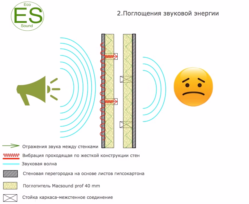 Для поглощения этих вибраций внутрь стены монтируют звукопоглощающие и пористые материалы (вата,macsound prof,акустический поролон).